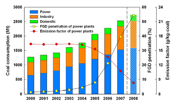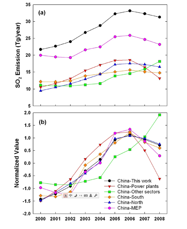 与此同时,中国的二氧化硫排放量是这样的 (Lu et al., 2010):