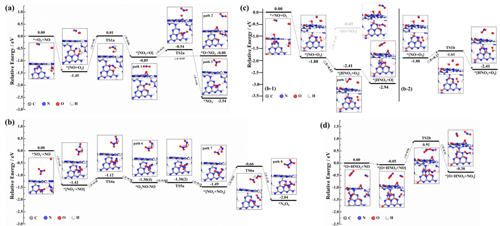 氮化碳(a,b)和羟基化氮化碳(c,d)表面NO反应势能剖面图