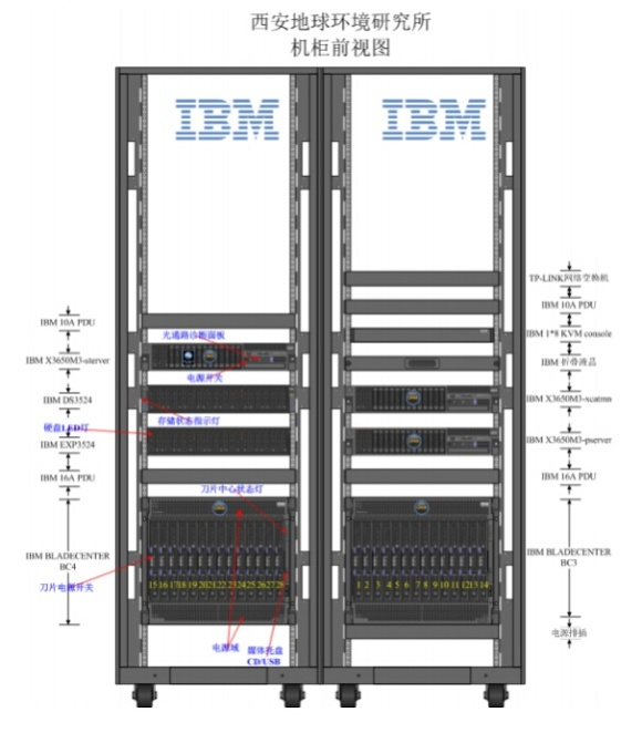两组BCH,各包括1个L2/3 Copper以太网交换机模块/1个40GB InfiniBand。28块刀片,HS22, 2*Xeon 6C X5675 95W 3.06GHz/1333MHz/12MB, 9*4GB, 300G/Bay 2.5in SAS,40GB IB